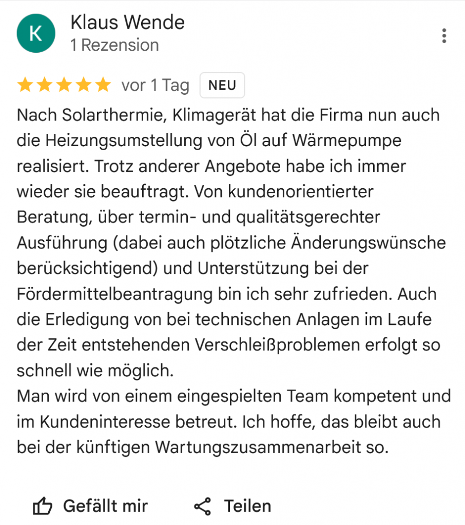 Dieser Leitsatz bringt auf den Punkt, wofür wir stehen: Wir planen und realisieren nicht einfach Technik – wir schaffen spürbaren Komfort und Lebensqualität. Ob neue Heizung, leise Klimaanlage oder ein modernes Bad: Unser Anspruch ist, dass unsere Kunden nicht nur zufrieden sind, sondern sich rundum gut betreut fühlen – vom ersten Gespräch bis zum letzten Handgriff.